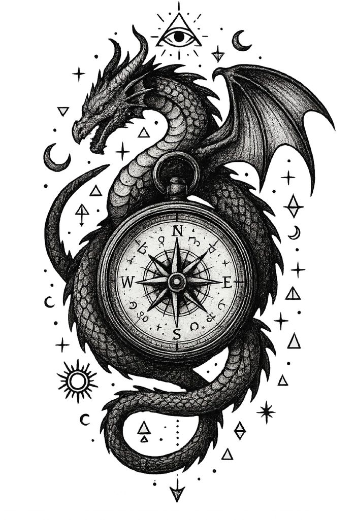Diese beeindruckende Tattoovorlage zeigt einen majestätischen Drachen, der sich um einen Kompass windet. Umgeben von mystischen Symbolen und astralen Elementen, vermittelt das Design ein Gefühl von Abenteuer und Entdeckung.