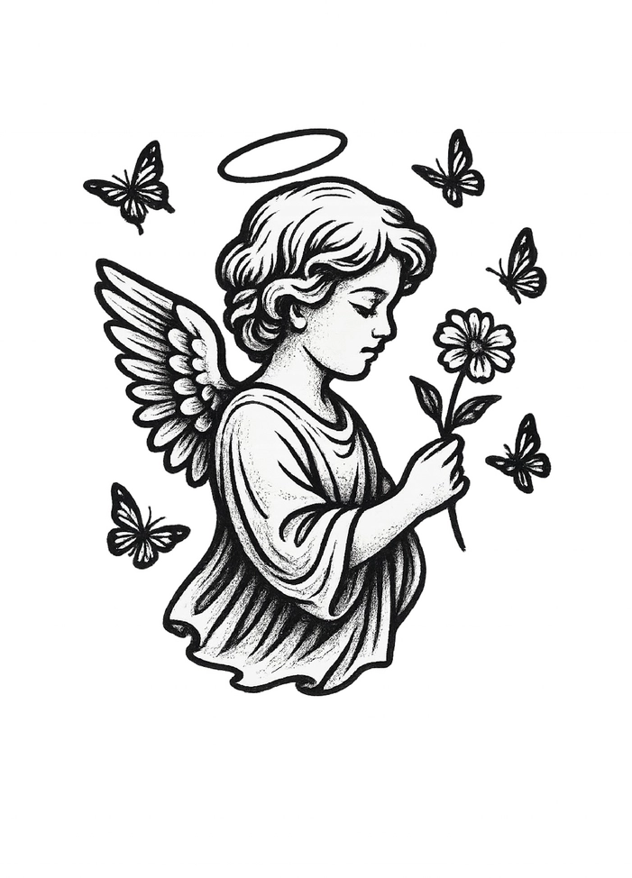 Diese Tattoovorlage zeigt einen Engel, der eine Blume in der Hand hält. Um ihn herum fliegen Schmetterlinge, was dem Motiv eine sanfte und verträumte Atmosphäre verleiht. Die stilisierte Darstellung in Schwarz-Weiß betont die Details und schafft einen harmonischen Eindruck.