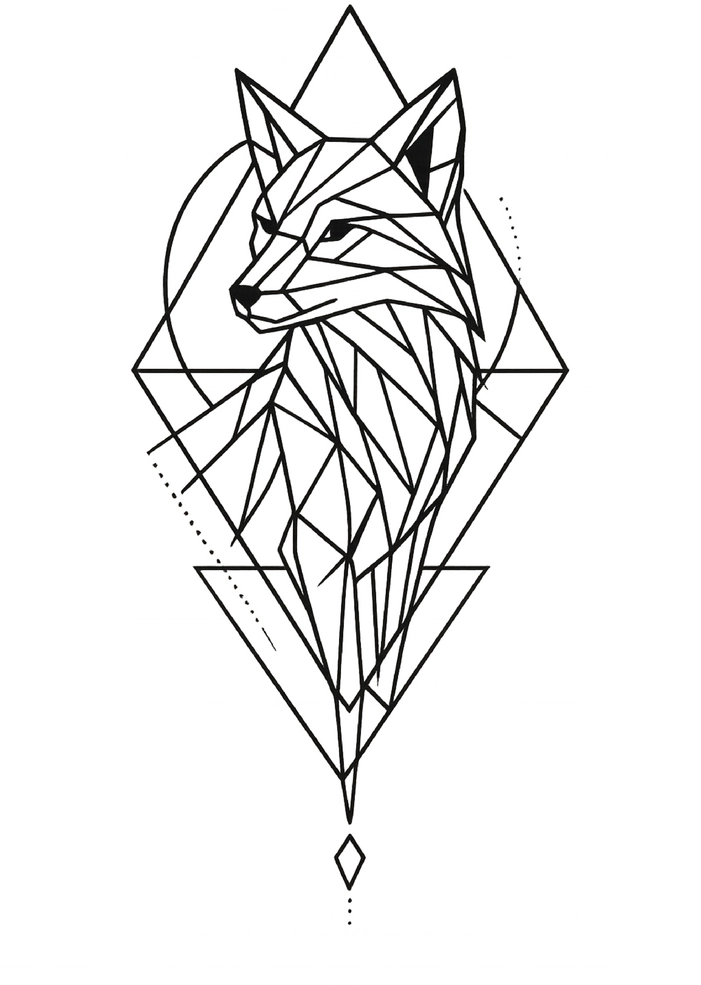 Die Tattoovorlage zeigt ein stilisiertes, geometrisches Wolfsmotiv, das durch klare Linien und moderne Formen besticht. Die Kombination aus symmetrischen und abstrakten Elementen verleiht dem Design eine dynamische Ausstrahlung, ideal für Tattoos auf der Schulter.