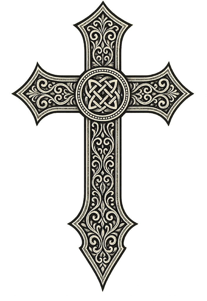 Diese Tattoovorlage zeigt ein kunstvolles Kreuz, das mit komplexen Mustern und keltischen Elementen verziert ist. Die detaillierte Gestaltung macht es zu einem außergewöhnlichen Design, das sowohl spirituelle als auch ästhetische Elemente vereint.