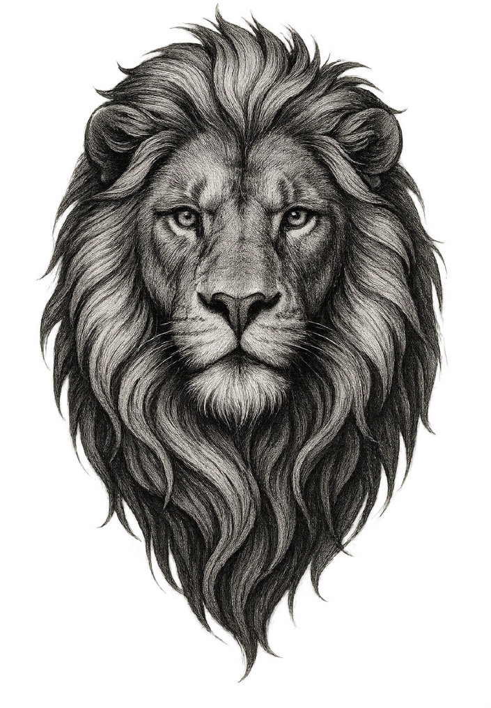 Diese Tattoovorlage zeigt einen beeindruckenden Löwenkopf mit detailreicher Mähne und intensiven Augen. Die kunstvolle Darstellung vermittelt Stärke und Majestät, ideal für ein kraftvolles Tattoo.
