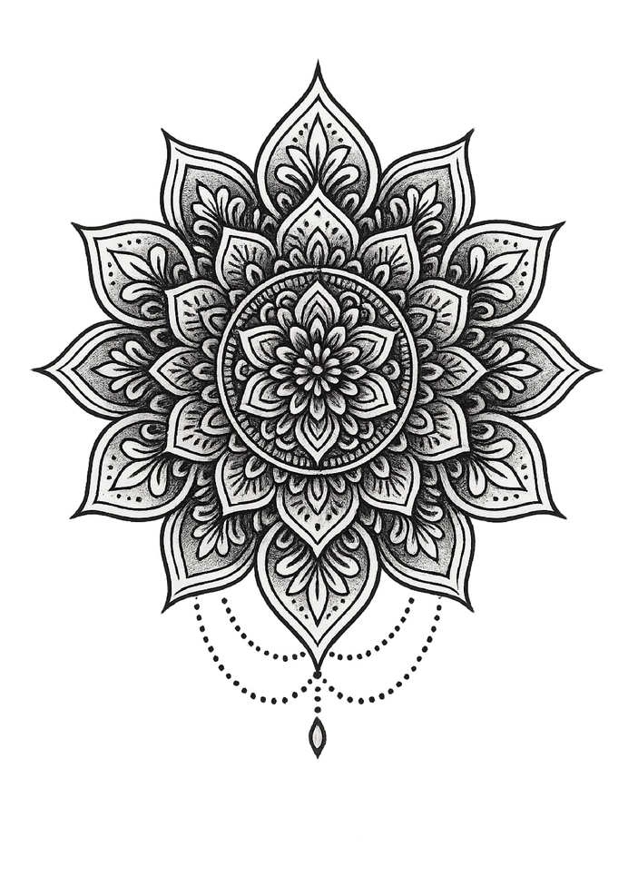 Diese Tattoovorlage zeigt ein beeindruckendes Mandala, das durch seine symmetrischen Muster und feinen Details besticht. Die Gestaltung ist nicht nur ästhetisch ansprechend, sondern vermittelt auch ein Gefühl von Harmonie und Ruhe. Ideal für Tattoos im Bereich der Rippen oder Hüfte.