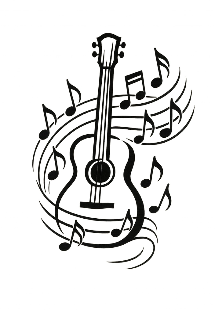 Stilisierte Gitarre mit Noten als Tattoo-Vorlage für Musikliebhaber.