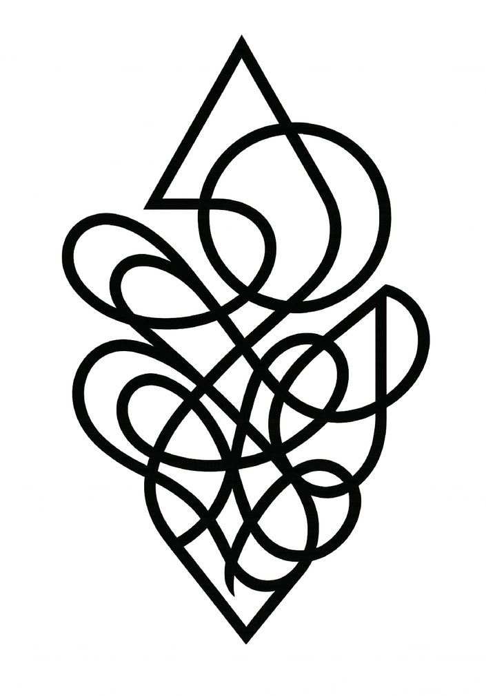 Die Tattoovorlage zeigt eine moderne, abstrakte Komposition aus verschlungenen Linien und geometrischen Formen. Die schwarz-weiße Gestaltung verleiht dem Design einen eleganten und zeitlosen Charakter, ideal für minimalistische Tattoo-Liebhaber.