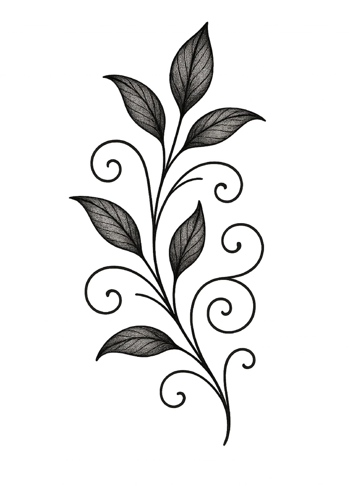 Elegante Tattoovorlage mit Ranken und Blättern in Schwarz-Weiß.