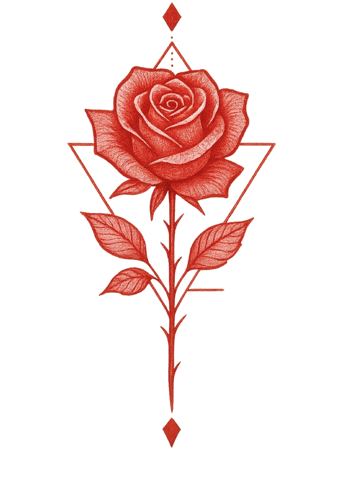 Die Tattoovorlage zeigt eine stilisierte rote Rose, umgeben von geometrischen Elementen. Diese Kombination verleiht dem Motiv eine moderne und ansprechende Note, die sowohl für Frauen als auch für Männer attraktiv ist.