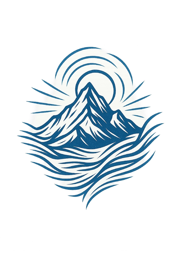 Diese Tattoovorlage zeigt eine stilisierte Darstellung eines majestätischen Berges, umgeben von sanften Wellen. Die klare Linienführung und die harmonischen Formen vermitteln ein Gefühl von Ruhe und Erhabenheit. Die Sonne strahlt über dem Gipfel und verstärkt den Eindruck von Naturverbundenheit.