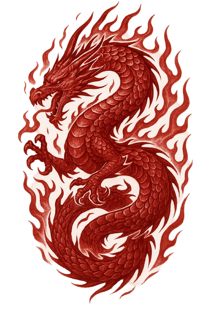 Die Tattoovorlage zeigt einen beeindruckenden Drachen, der von lebhaften Flammen umgeben ist. Diese dynamische Darstellung symbolisiert Stärke und Energie, ideal für eine Rückentattoo. Die kunstvollen Details der Schuppen und die aggressive Pose des Drachen verleihen dem Design eine eindrucksvolle Wirkung.