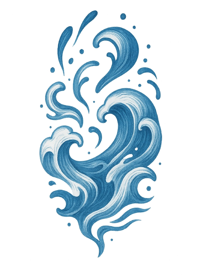 Die Tattoovorlage zeigt eine dynamische Darstellung von Wellen und Wasserformen, die in sanften Blautönen gestaltet sind. Die geschwungenen Linien und Details vermitteln ein Gefühl von Bewegung und Lebendigkeit, ideal für Liebhaber von natürlichen Motiven.