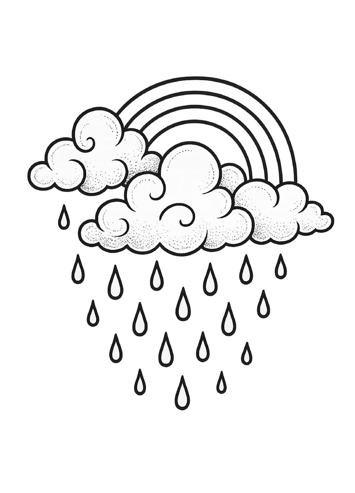 Diese Tattoovorlage zeigt eine stilisierte Wolke mit einem farbenfrohen Regenbogen und fallenden Regentropfen. Die Kombination aus Wolken und Regen vermittelt eine lebendige und fröhliche Stimmung, die perfekt zu einem Oberarmtattoo passt.